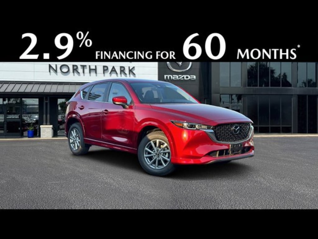 2.9% Annual Percentage Rate (APR) available on approved credit only for very well-qualified customers when financing a new 2025 MAZDA CX-5 through Mazda Financial Services at participating Mazda Dealers. 2.5 S, Select, Preferred, Carbon Edition and Premium Plus trims ONLY. Not all customers will qualify for credit approval or advertised APR. Amount of down payment and other factors may affect qualification. Finance rate is in lieu of customer cash. Dealer contribution may vary and could affect purchase price and amount to be financed. 60 months at $17.92 per month per $1000 financed with $0 down at participating Mazda Dealers. Tax, title, license, other options, loan origination fees and dealer fees may apply. Void where prohibited. This offer is only available on participating Mazda Dealer?s current inventory, which is subject to availability. Offer ends 1/5/2026 and you must take delivery prior to expiration of offer.